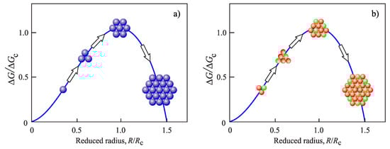 as first suggested by Volmer and Weber [43]. Here, is the Boltzmann constant and T the absolute temperature. The pre-exponential term, , reflects the kinetics of aggregation processes described, in particular, by the appropriate diffusion coefficient. Thermodynamic aspects are mainly represented in Equation (1) by the work of critical cluster formation. This quantity is of essential significance for the correct description of nucleation processes and will be discussed here first.