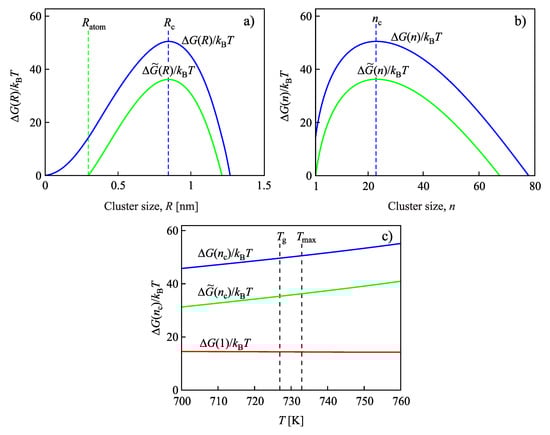 Work of cluster formation (divided by ) for crystallization of lithium disilicate, (L2S), as a function of cluster size and temperature: (a) and versus R at K. is given by Equation (7), and is defined in analogy to Equation (11) as . (b) and versus n at K; and are computed via Equations (8) and (12), correspondingly, and is obtained from Equation (8) setting n equal to . (c) Work of critical cluster formation, , , and the self-consistency correction, , for L2S as a function of temperature. The thermodynamic driving force is computed via Equation (6) with K, J/m, , m [73,74]. These expressions and parameter values are also used in the subsequent figures. The surface tension is taken as . is defined as the radius of the atoms or molecules of the liquid undergoing crystallization.