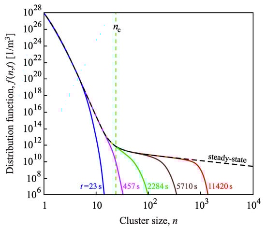 Evolution of the cluster-size distribution function as a function of time at a temperature K. The diffusion coefficient was also taken to model crystal nucleation in L2S utilizing Equation (20) with and . The thermodynamic parameters and the value of are given in the caption to Figure 2. The dashed curve is computed via the analytical expression, Equation (32), employing the result for the steady-state nucleation rate obtained from the numerical computations.