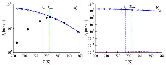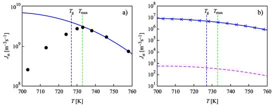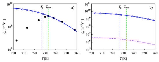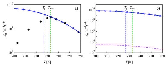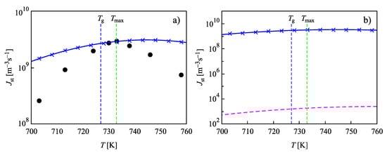 In Figure 4, the steady-state nucleation rates for L2S versus temperature are shown, computed via the different methods discussed in Section 2. Again, the results are obtained employing the capillary approximation. The full circles in Figure 4a show experimental data as reported in [73,74], and data shown by crosses are the numerically calculated nucleation rates obtained by solving the set of kinetic equations, Equations (14)–(22). The value of the surface tension was chosen as to yield the best fit of the experimental data at temperatures, , corresponding to the maximum of the steady-state nucleation. The full blue line shows the theoretical curve obtained via Equation (27), when in the analytical expression, self-consistency corrections are accounted for. By , the glass transition temperature is specified according to the definition of Tammann [89], who identified the glass transition temperature with values of the Newtonian viscosity equal to Pa s. Results of numerical computations and the predictions based on Equation (27) coincide.