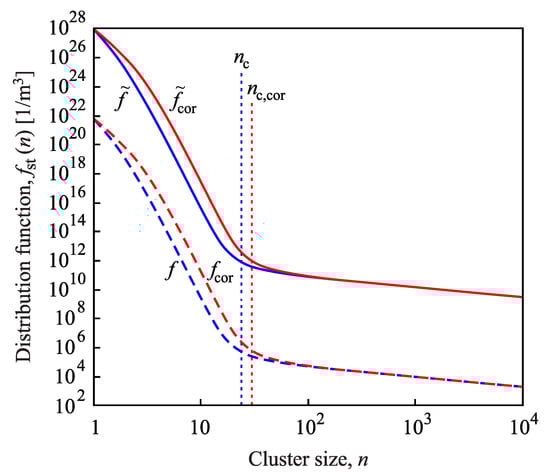Both relations, Equations (32) and (33), show that also with respect to the correct expression for the steady-state cluster-size distribution, the question concerning the relevance of introduction of self-consistency corrections occurs. Both equations (Equation (32) via ) depend on the work of formation of a given cluster, consequently, the question is whether either or has to be substituted into these relations.