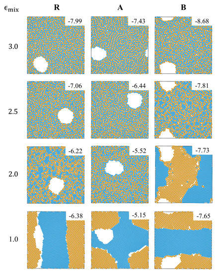 The R, A and B systems with undergo a transition from a homogeneous (on length scales larger than molecular size) fluid mixture (at ) to a homogenous glass (at ) that contains large voids (see the top panels in Figure 1 and movies S1–S3 in Supplementary Materials). In agreement with the expectation that the shape and composition of the interface between the condensed and the gas (void) phases are determined by surface tension minimization, in systems A and B the interfaces are enriched in weakly interacting components, i.e., small particles in the A system and big ones in the B system. Visual inspection of snapshots of the three systems taken during the process of cooling shows that the transition from a homogeneous fluid to a homogeneous glass can be characterized by the appearance of large voids that must accompany the increase of the density as the system solidifies at constant volume (not shown). Based on this criterion and on the observed change of slopes in the potential energy vs. temperature curves in Figure 2 (for ), the glass transition temperature falls in the range – in the three systems.