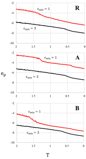 We proceed to examine the case where in all systems there is a gradual demixing process from a homogenous liquid into liquid-like clusters of small and big particles that begins already during the first step of cooling at rate to (not shown). As temperature is further decreased (see movies S4–S6 in Supplementary Materials), these clusters grow in size and eventually only two segregated large clusters of big and of small particles remain. At yet lower temperature, the three systems undergo partial freezing in which one of the components freezes while the other component remains in the liquid phase and freezes upon further cooling (complete freezing). As shown in Figure 4, in systems A and B partial freezing (of big and of small particles, respectively) takes place at , which is the freezing temperature of a one-component system with . Complete freezing of both components (freezing of small and of big particles in systems A and B, respectively) occurs at which is the freezing temperature of a one-component system with [20].