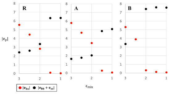 The potential energy per particle components (mixed and single-size interactions) in systems R, A and B as a function of at T = 0.