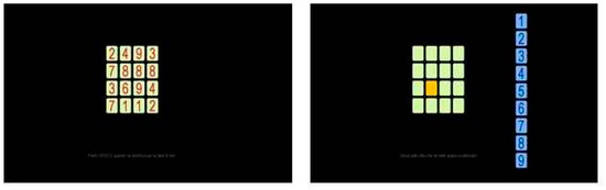 Sixteen digits (1 to 9) were randomly assigned to a 4 × 4 grid on the screen, obviously with repetitions. Participants had to memorize at their own pace the digit at every position in the grid. Once they were ready, the digits disappeared together. Then, a random cell lit up and they had to insert the correct digit into it. The list of digits was available on the same screen in a vertical line to the right, so they could directly click on the one they chose (see Figure 3). As with all other tests, no feedback was given.