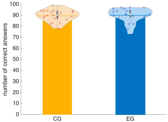 Results of the N-back experiment. There is no significant difference in the performance of control group (CG) and experimental group (EG). The violin plot uses the standard conventions: the full dots represent individual scores, the white dot represents the median and the grey thick bar represent the interquartile range.