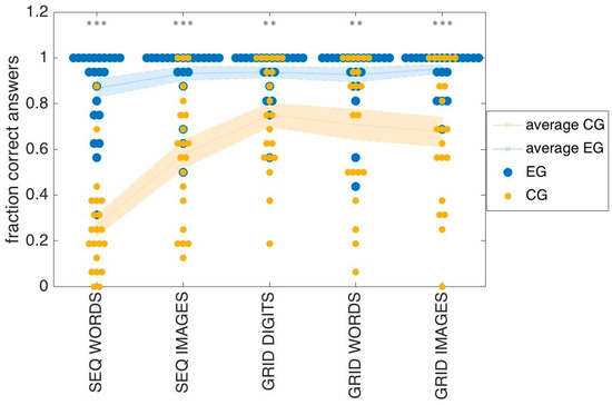Figure 6 shows the results of the N-back test. Both groups are quite accurate in their answers, with an almost equal performance: 89% ± 5% for the controls and 90% ± 6% for the experimental group (mean ± SD; Mann–Whitney U (MW-U) test p = 0.5). The color code is consistent throughout the paper, with a yellow color (or warm palette) for the control group and blue (cold palette) for the experimental group.