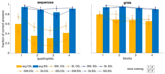 Performance in quadruplets. Yellow and blue bars represent the average across participants and across stimulus conditions of the fraction of correct answers given for each of the four quadruplets of stimuli (for the two sequence tests, they are defined by the order of presentation; for the grid tests by the quadrant on the grid). The lines report the performance separately for each of the two sequence tests, and the error bars represent the standard error of the mean across participants. “EG” = experimental group; “CG” = control group; “SW” = sequence words; “SI” = sequence images; “GD” = grid digits; “GW” = grid words; “GI” = grid images.