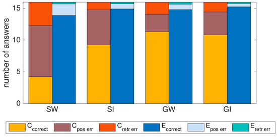 Relative frequency of correct answers and of errors, classified as ordinal position errors of items in the list of 16, and errors of retrieving items not among the 16. “E” = experimental group; “C” = control group; “SW” = sequence words; “SI” = sequence images; “GW” = grid words; “GI” = grid images.
