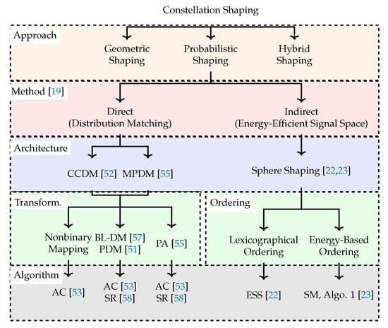 There exist numerous techniques in the literature, most of them proposed in the late 1980s and early 1990s, that attempt to close the shaping gap. Motivated by the fact that the capacity-achieving distribution for the AWGN channel is Gaussian, these techniques fundamentally take one of the following approaches. The first is to construct a signal constellation with a Gaussian-like geometry as illustrated in (Figure 4.49 in []), which is called geometric shaping (GS) [,,,,,,,]. The other approach is to induce a Gaussian-like distribution over the signal structure, which is called probabilistic shaping (PS) [,,,,]. PS techniques can be further classified into two subgroups using the terminology introduced by Calderbank and Ozarow in []. The direct approach is to start with a target distribution (which is typically close to the capacity-achieving distribution) on a low-dimensional signal structure and have an algorithm try to obtain it [,]. Following recent literature [], the direct approach can also be called distribution matching (DM). The indirect approach is to start with a target rate and bound the n-dimensional signal structure by a sphere, which we call sphere shaping (SpSh) [,]. Here, a (sampled) Gaussian distribution is obtained indirectly (when ) as a by-product. Finally, there exist some hybrid shaping approaches in which GS and PS are combined [,,]. We refer to (Section 4.5 in []) for a detailed discussion on GS, and to (Chapter 4 in []) and (Section II in []) on PS. GS, PS, and hybrid shaping are shown on the top layer of Figure 1 where the taxonomy of constellation shaping (as discussed in the current paper) is illustrated. We call this first layer shaping approach. On the second layer which we call shaping method, PS is split into two following the Calderbank/Ozarow terminology [].