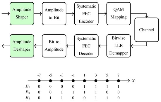 Recently, probabilistic amplitude shaping (PAS) has been proposed to provide low-complexity integration of shaping into existing binary FEC systems with BMD []. PAS uses a reverse concatenation strategy where the shaping operation precedes FEC coding, as shown in Figure 2 (top). This construction has been first examined for constrained coding problems []. A corresponding soft-decision decoding approach for this structure was studied in []. PAS can be considered as an instance of the Bliss architecture [] where in the outer layer a shaping code is used, and then in the inner layer parity symbols are added. The main advantage of this structure is that amplitude shaping can be added to existing CM systems as an outer code. (We note here that in optical communication literature, the term “intensity modulation” is used to designate amplitude modulation in general. To be consistent with the constellation shaping literature, we prefer to use the term “amplitude shaping” in this study.) In addition to closing the shaping gap, PAS also has rate adaptation functionality in the shaping layer. This means that instead of using many FEC codes of different rates to obtain a granular set of transmission rates, the rate can be adjusted by the amplitude shaper with a fixed FEC code. Owing to these advantages, PAS has attracted a lot of attention. PAS has been combined with low-density parity-check (LDPC) codes [], polar codes [] and convolutional codes []. Its performance has been evaluated over the AWGN channel [], optical channels [,], wireless channels [] and parallel channels with channel state information available at the transmitter [].