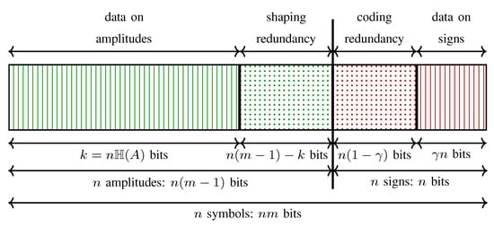 In the PAS architecture, to obtain a target rate using the -ASK constellation, a total of redundancy bits are added to a channel input sequence by shaping and coding operations combined. Shaping is responsible for redundant bits whereas coding adds bits. This is illustrated in Figure 4 where the content of a channel input sequence produced by the generalized PAS architecture of Figure 3 (bottom) is shown. The striped areas represent the information carried in signs (red) which is bits, and in amplitudes (green) which is bits. Dotted areas show the redundant bits in a sequence. When , i.e., , all signs are selected by redundancy bits and thus, the striped red area in Figure 4 vanishes. When , the amplitudes are uniformly distributed, i.e., there is no shaping, and thus, the dotted green area in Figure 4 disappears. We note that a similar illustration was provided for a single ASK symbol in (Figure 9 in []). In Table 1, the content of a sequence at the output of a PAS transmitter (in accordance with Figure 4) is tabulated for Example 2 where .