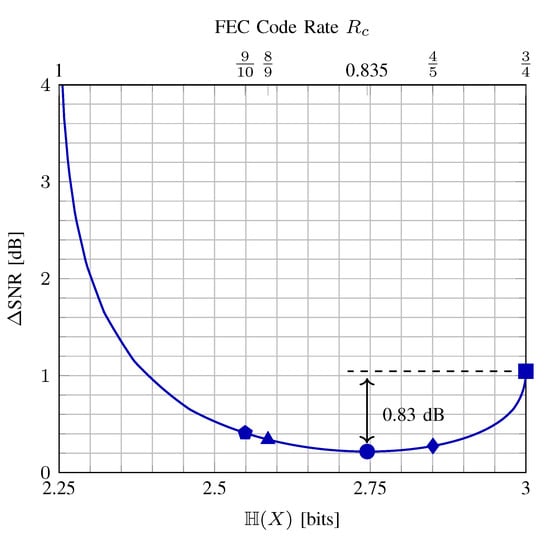 (Optimal PAS parameters). In Figure 5, the entropy of an input X with MB-distributed amplitude levels (i.e., 8-ASK) vs. is plotted for bit/1-D. On the top horizontal axis, the corresponding FEC code rates (14) are also shown. The rightmost point (indicated by a square) corresponds to uniform signaling where the target rate of 2.25 bit/1-D is obtained by using a FEC code of rate . In this trivial case, all 0.75 bits of redundancy are added by the coding operation, and the gap to capacity is 1.04 dB. The leftmost part of the curve where goes to R belongs to the uncoded signaling case, i.e., , where R is attained by shaping the constellation such that . Here is infinite since without coding, reliable communication is only possible over a noiseless channel. The minimum in Figure 5 is obtained with , which corresponds to from (14). In IEEE DVB-S2 [] and 802.11 [], the code rate that is closest to 0.835 is . Accordingly, the best performance is expected to be provided with rate- FEC code, with an SNR gain over uniform that amounts according to this analysis to 0.83 dB. This will be confirmed by the numerical simulations presented in Section 5.3.