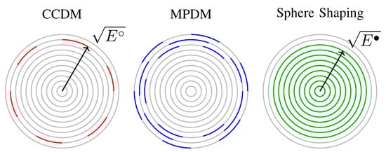 CCDM has been proposed in [] and it was used as the amplitude shaping architecture for PAS in []. We speak of constant composition if all matcher output sequences are permutations of a particular base sequence, which is typically described by the composition C stating the number of occurrences of each amplitude. The number of output sequences of the corresponding matcher, i.e., the cardinality of the shaping set , is given by the multinomial coefficient , as defined in (5). Each amplitude sequence in has the same energy , and consequently, they all are located on the n-shell of squared radius as shown in Figure 6.