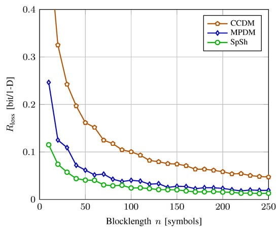 where (a) is due to the finite blocklength n and (b) is due to the binary-input nature of the shaping algorithm, i.e., the rounding in (8). Here is the entropy of in bits. In (9), both (a) and (b) are satisfied with equality when for asymptotically optimum amplitude shaping architectures. The rate loss of a shaping set with average distribution can then be defined in bit/1-D as
