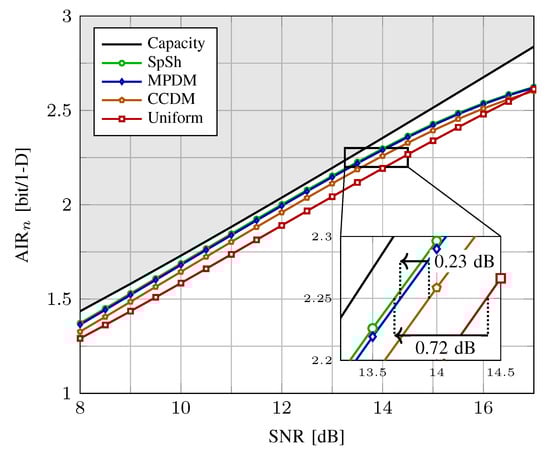 as the metric to be minimized when searching for the optimum MB distribution for a fixed rate R and constellation size . In general, the gap-to-capacity can be computed for any parametric family of distributions. Here we only consider the MB distributions since they have been shown to perform very close to the capacity of ASK constellations over the AWGN channel and maximize the energy efficiency []. The numerator in (13) is the SNR value at which for a given , and the denominator is the SNR value at which the capacity . We note that instead of the MI in (Equation (55) in []), we now use the BMD rate of (12). Observing from Figure 4 that , the rate of the FEC code that should be employed in PAS to obtain a transmission rate R for a given constellation entropy is given by