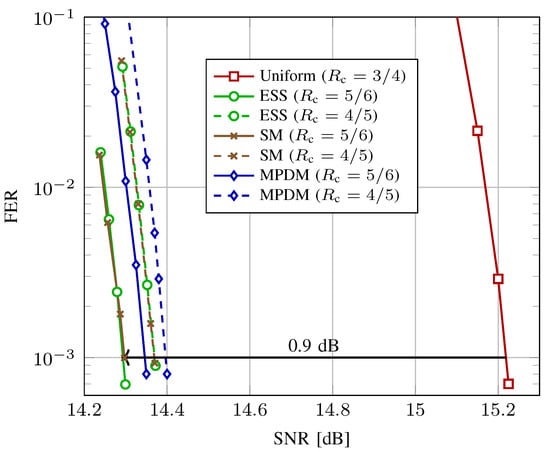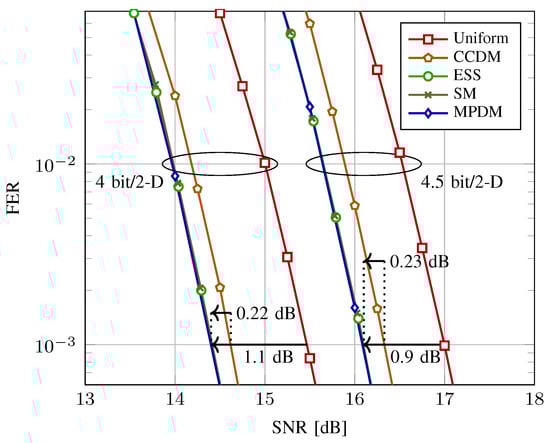 - Steiner, F.; Böcherer, G. Comparison of geometric and probabilistic shaping with application to ATSC 3.0. In Proceedings of the 11th International ITG Conference on Systems, Communications and Coding, Hamburg, Germany, 6–9 February 2017. [Google Scholar]
