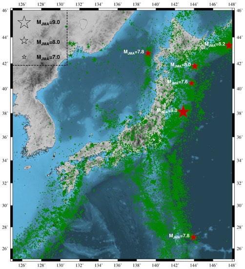 (color online) Epicenters (red stars) of all six shallow EQs with M ≥ 7.6 within the area N E since 1 January 1984 until the M9 Tohoku EQ. The smaller green stars indicate the epicenters of all M ≥ 3.5 EQs.