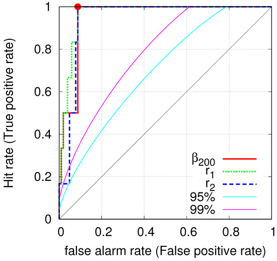 By means of the latter method, the AUC corresponding to the precursory variations of the Earth’s electric and magnetic field that precede EQs in Greece in the 1980s, see, e.g., Dologlou [56], (i.e., the two points depicted in Figure 4 of Reference [57]) and EQs in Japan in the 2000s, see, e.g., Han et al. [58], (i.e., the two points in Figure 8a,b of Reference [57]) can be estimated. They are 0.625 and 0.658 for the two operating points in Figure 4 of Reference [57] and 0.869 and 0.943 for the the two operating points shown in Figure 8a,b of Reference [57], respectively. These four AUC exceed the one shown in Figure 11 of Reference [59] which has been calculated for the relationship between magnetic field pulses and EQs in California.