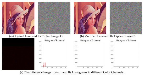 For demonstration, we modify the standard Lena image by increasing the first-pixel value by 1 and decreasing the second-pixel value also by 1 in the R channel, and then compare the corresponding cipher image with that of the standard Lena image. The results are shown in Figure 2 and Table 1, the details of two widely used measures, number of pixels change rate (NPCR) and unified average changing intensity (UACI), will be given in Section 5.2.5.