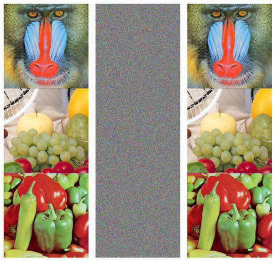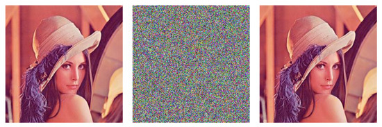For demonstration, here we choose and , which satisfy all of the conditions given in Equation (14). First, we use to encrypt the benchmark image Lena (left, Figure 1) and obtain the corresponding cipher image (middle, Figure 1). Subsequently, we use to decrypt the cipher image and obtain the recovered image (right, Figure 1).