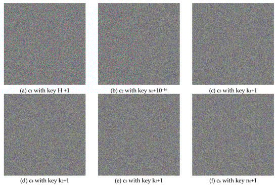 A cryptosystem might suffer from differential attacks if cipher images that are generated from different keys are similar. Thus, a secure encryption algorithm should be highly sensitive to all keys, which means even a tiny change in the secret key will lead to a completely different cipher image.