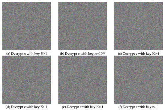 Figure 4 illustrates the plain, cipher, and decrypted Lena images. We change , and by one bit (i.e., for and 1 for and ) to obtain six new cipher images, and the results are shown in Figure 8. Figure 9 shows the differential results between these six cipher images and the cipher image obtained in Figure 4b. Furthermore, we use the six one-bit difference key groups to decrypt Figure 4b, and the decrypting results are shown in Figure 10.