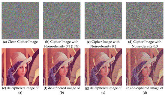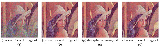 (a) Noise-adding Attack: the ciphered and the de-ciphered images that are presented in Figure 11 are obtained based on the enhanced CIES-UBPRPD, in which the testing ciphertext images have been contaminated by adding with different degrees of salt-and-pepper noises. For performance analysis, we employ the widely used Peak Signal-to-Noise Ratio (PSNR) to evaluate the algorithm’s restoring ability. That is