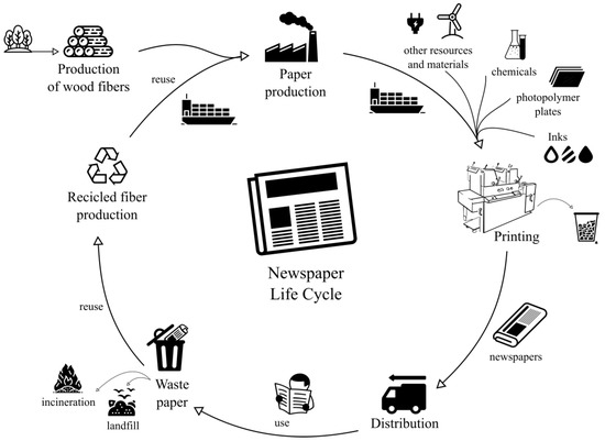 The production process of a printed newspaper from cradle to grave, considering paper recycling, is shown in Figure 1.
