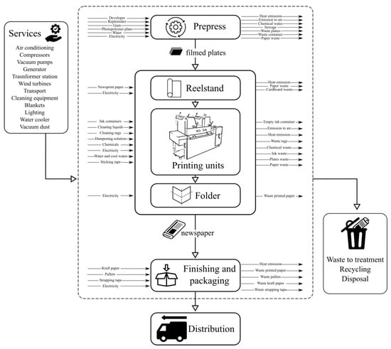 In our previous article [14], life cycle analysis of the production process of a newspaper is presented, taking real inventory data from a plant in operation on the island of Gran Canaria (Spain). The product system of this study is “printed newspaper by coldset technology”. System boundaries cover different stages of the production process that are grouped into the following process units: