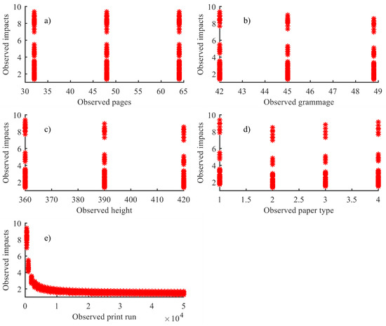 Representation of each individual variable against the impact. Individual behaviour of impacts vs. (a) number of pages; (b) grammage; (c) heights (d) paper types and (e) print run.