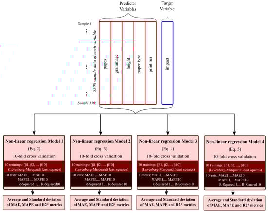In Figure 4 is shown a schematic representation of the procedure used to evaluate the four non-linear models used in this study. As can be observed in the upper part of the figure, from the whole dataset collected for the study, predictor variables (inputs to the models) and target variables (output of the model) are distinguished. Then, the 10-fold cross-validation technique [27] is used to train and test each model ten times.