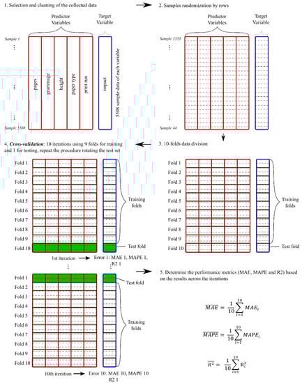 - This procedure is repeated 10 times for each model, to rotate the test dataset and obtain 10 evaluations in each case. As results, 10 values of error, calculated following a statistic metric formulation, are obtained. The statistical metrics considered measure the error between the true value of the response and the estimated value obtained by the model. In this study, the error metrics considered were MAE, MAPE and R-squared.