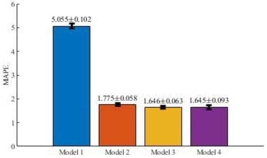 Analogously, Figure 7 and Table 3 represent the average means and standard deviations for the MAPE results obtained for the models defined by Equations (2)–(5).