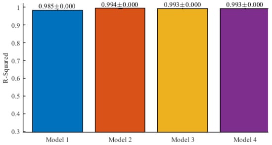 Finally, Figure 8 and Table 4 show the average means and standard deviations for the R-squared results obtained for the models (Model 1, Model 2, Model 3 and Model 4) defined by Equations (2)–(5), respectively.