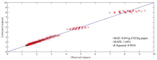 In Figure 9, the ordinate axis represents the estimations of impact values (measured in kg CO2/kg paper) performed by Model 4 (the model which achieved the best performance). The abscissa axis represents, meanwhile, the true values observed for each estimation carried out by the model. As results, interceptions between true values and estimated values are obtained for each sample of the data and are represented as red crosses. The blue line (with a slope of 45 degrees) represents the best possible estimation. A red cross over the blue line means that observed value and estimated value are equal and a perfect match between model and reality has been achieved in that individual estimation. In this figure, it can be seen that estimations of low impacts are better than estimations of impacts with medium and high magnitudes. However, it is possible to check that all cases are well distributed on both sides of the blue line. This is reflected by the low value results of standard deviation as well. The final β parameters obtained for each model are presented in Table 5.