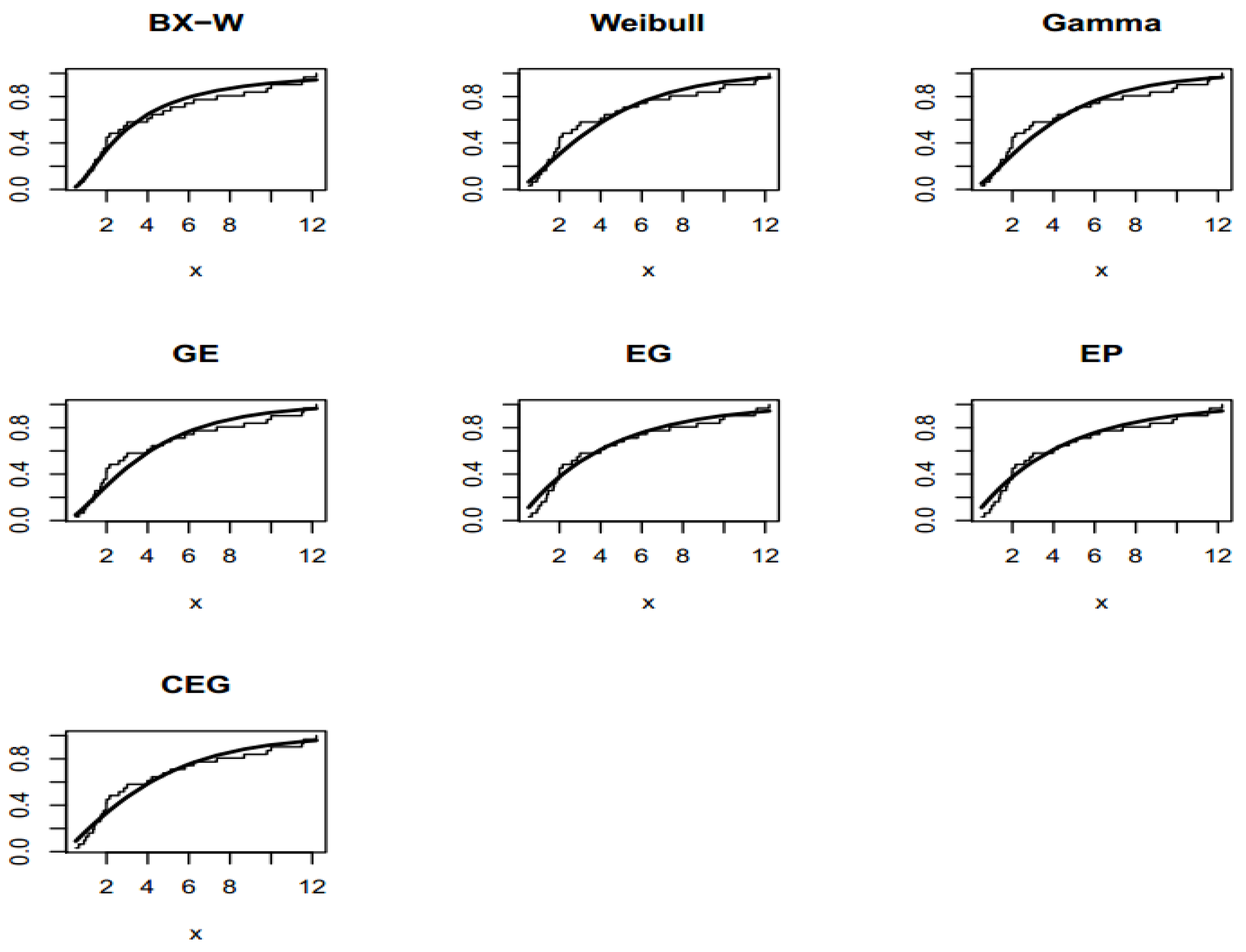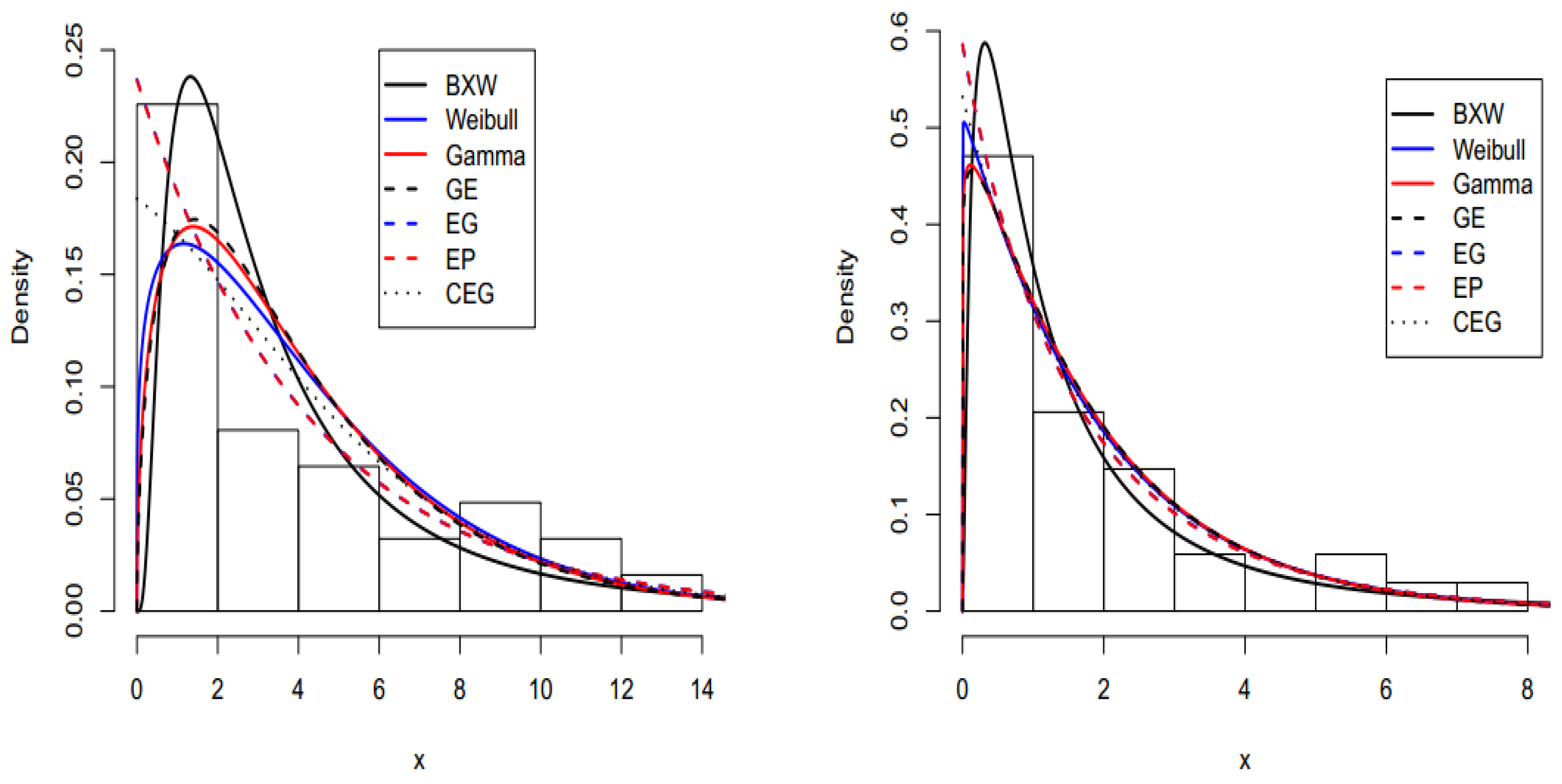 - Mudholkar, G.S.; Srivastava, D.K.; Freimer, M. The expnentiated Weibull family: A reanalysis of the bus-motor-failure data. Technometrics 1995, 37, 436–445. [Google Scholar] [CrossRef]