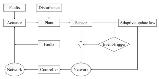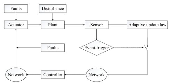The basic architecture for event-triggered adaptive fault-tolerant control is shown in Figure 1. It is obvious that the introduced event-trigger control mechanism is different from the traditional fault-tolerant control system. Whether the real-time data of the sensors can be transmitted is determined by the event-triggered mechanism.