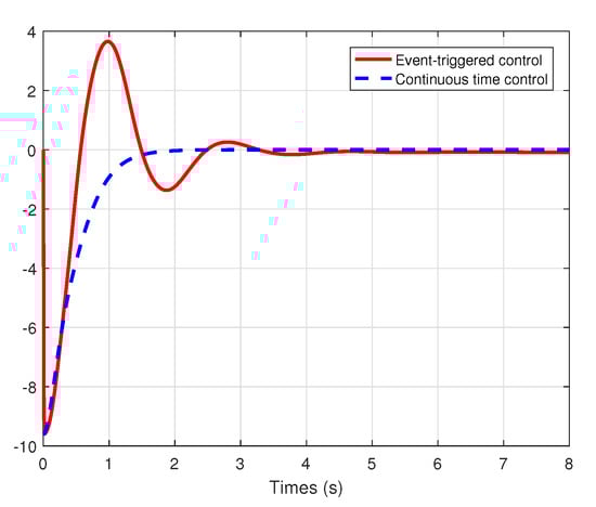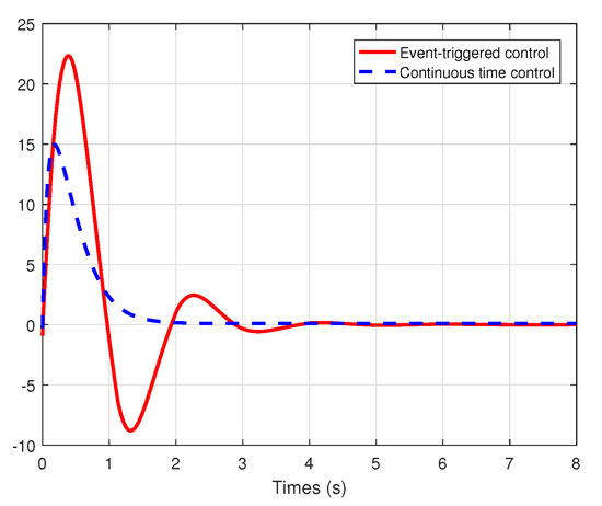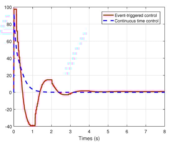 From the simulation results shown in Figure 3 and Figure 4, it can be seen that all the states are globally bounded and convergent, then the good set-point regulation performance can be achieved by the proposed methodology in the paper. In this way, the regulation of the fan speed v is achieved, even under the external disturbance in the armature voltage and the actuator faults. Moreover, Figure 5 shows the trajectories of the control signals under event-triggered control and continuous time control. The event-triggered control signal are constant in some time intervals, then the proposed event-triggered FTC mechanism can increase the utilization of valuable network resources. Therefore, an appropriate compromise is realized between control performance and real-time transmission consumption.