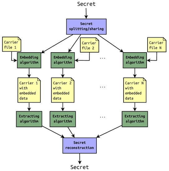 Sometimes, the steganography is used solely; in other cases, it is combined with other means of information security [5]. The one example is to disperse the message in the container with steganographic key. Another is distributed steganography in which the secret is split into some shares that are later embedded in multiple carrier files. The files with payload may be saved in remote locations or in a cloud. To reveal the secret, required number of shares should be recovered first. The general scheme of this approach is presented in Figure 1.