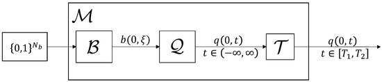 Information can be embedded in the scattering coefficients in various ways. In this paper, we consider the techniques where information is embedded only in for , i.e., we consider signals without solitons. The idea of embedding information in is known as b-modulation [26]. The advantages of b-modulation are tight control over signal duration and lower sensitivity w.r.t. noise [11,26]. If the signals are of infinite duration, they are truncated to some finite interval . From Equation (10), we can see that the energy of a b-modulated signal can be controlled by varying . This indirectly allows us to control the average power of the truncated signal. In this paper, we will concentrate on b-modulation in the case of anomalous dispersion ().