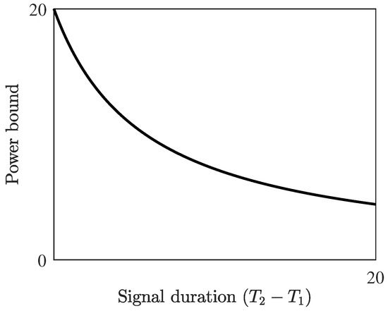 The power bound from Theorem 1 for , and . The transmit power of any b-modulator with these fundamental parameters must approach zero for long durations.