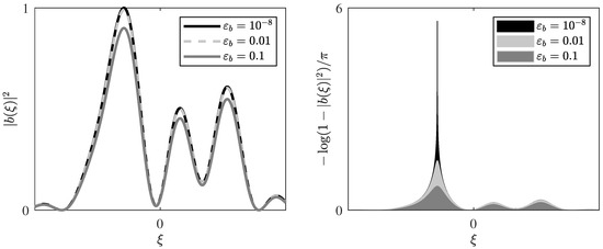 As already discussed earlier, in the case of anomalous dispersion, it is required that for real . In special cases, even simple signals such as the rectangle and hyperbolic secant can have isolated spectral singularities at which [25] [Chapter 2]. In the presence of spectral singularities, the usual theory behind the NFT unfortunately breaks down and has be to extended in a quite complicated manner [24]. Many algorithms available in literature for computing the time-domain signal starting from break down in their presence [26,30]. In practice, to avoid the complications arising from the spectral singularities, a “gap to singularity” is typically enforced by either clipping [19,31] (The use of clipping in [31] was reported in [12] [p. 1574], not in the paper itself.), scaling [26,31], and/or reshaping [12] of . In [21], the constellation was reshaped. The gap to singularity cannot be made arbitrarily small as the numerical algorithms are limited by the computing precision. Since any number that is closer to one than the machine precision is rounded to one, gaps to singularity smaller than machine precision cannot be represented with floating point numbers. As soon as the gap to singularity is never zero, the following power bound applies.