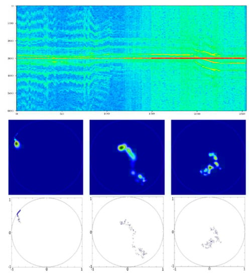 Illustration of Statistics of Doppler Spectrum as densities of points in Poincaré polydisc where SU(1,1) Lie group act transitively. Top is a time-doppler frequency spectrum of a drone. Bottom is a Doppler spectrum fluctuation coded as densities in Poincaré Polydisk.