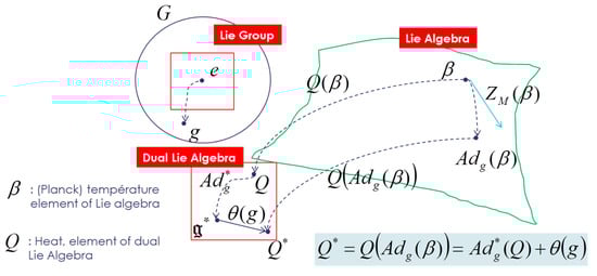 Fondamental Equation of Souriau Lie groups Thermodynamics. Q is the geometric heat in dual Lie algebra, β is the geometric temperature in Lie algebra.