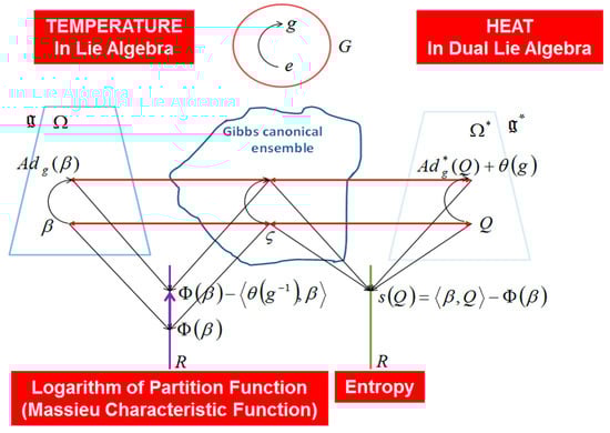 We can express the Gibbs density with respect to by inverting the relation . Then with . All Souriau equations of Lie groups Thermodynamics are illustrated in Figure 3 and Figure 4.