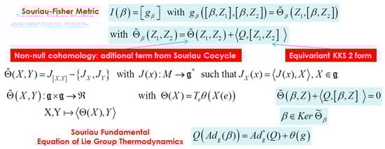 When coadjoint action is not equivariant, the symmetry is broken, and new “cohomological” relations should be verified in Lie algebra of the group. A natural equilibrium state will thus be characterized by an element of the Lie algebra of the Lie group, determining the equilibrium temperature . The entropy , parametrized by the geometric heat (mean of energy , element of the dual space of the Lie algebra) is defined by the Legendre transform of the Massieu potential parametrized by ( is the minus logarithm of the partition function ).