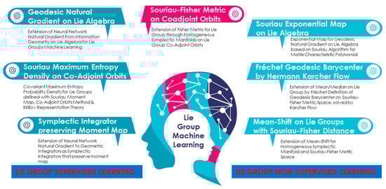 - Barbaresco, F. Souriau Exponential Map Algorithm for Machine Learning on Matrix Lie Groups; Springer Science and Business Media LLC: Berlin/Heidelberg, Germany, 2019; pp. 85–95. [Google Scholar]