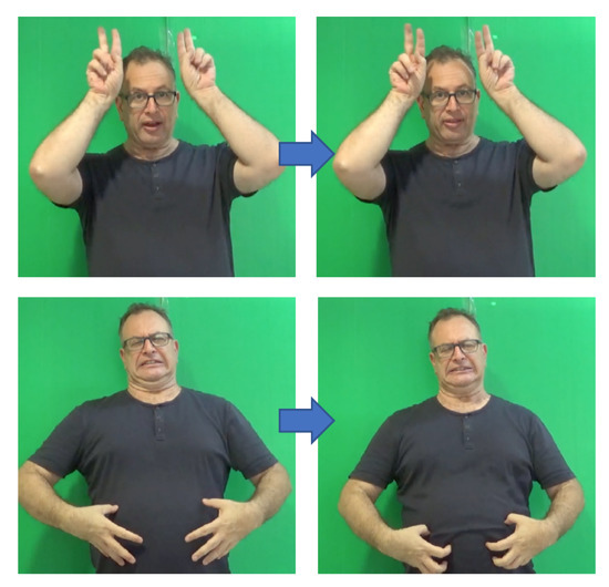 Examples of different locations in ISL signs. Top—the sign BUNNY signed on top of the head, bottom—the sign CONTRACTION signed on the stomach.