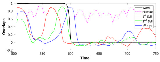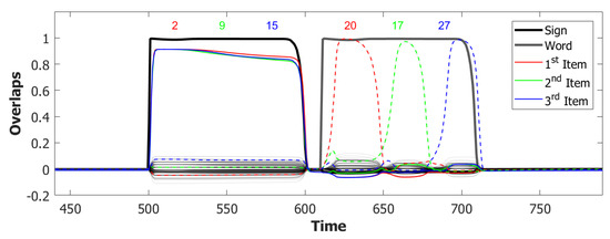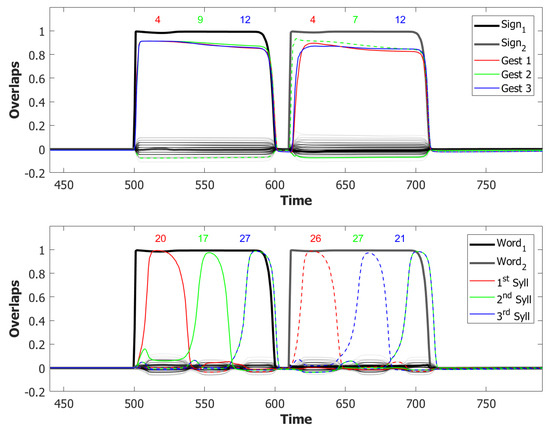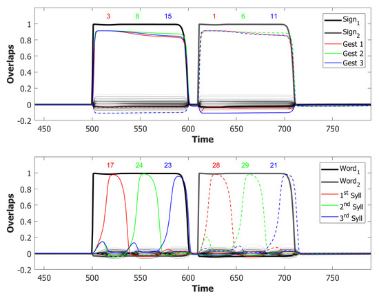Such dynamics is guided, absent other factors, by correlations between the different memory attractors [102]. Examples of latching sequences can be seen in Figure 5. Increasing the number of learned patterns, from to to , the length of the sequence increases, but eventually to the detriment of the quality of retrieval. In [99], narrow bands are identified in and planes, where lengthy latching sequences co-exist together with good retrieval of each individual attractor visited by the network, both when inhibition is slow and when it is fast. Whichever parameter one considers, in fact, one finds that it can vary only in a narrow range between when latching is limited in duration and when its quality deteriorates. However, a recent result is that the combination of slow and fast inhibition expands the region in parameter space where protracted good quality latching prevails.
